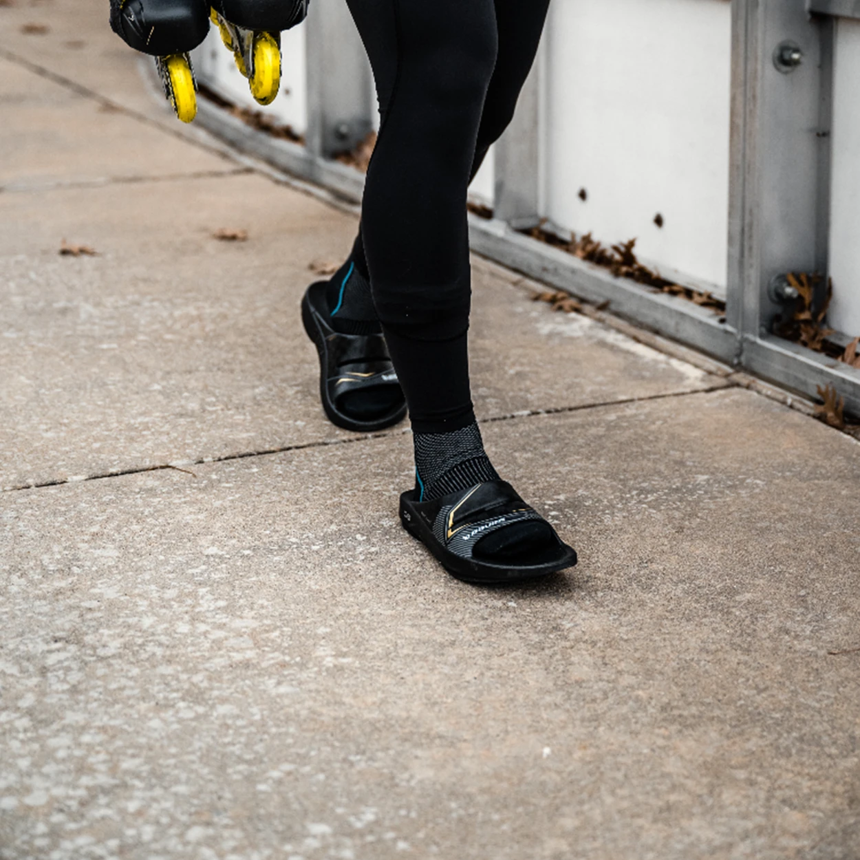 The BAUER | OOFOS Bartlett Sandal may run small. If you are between sizes, we recommend sizing up. Easy to slide on and off between ice time or training sessions, this sport slide features OOfoam™ technology and a patented footbed for additional support. This unique foam technology absorbs impact, so your body doesn’t have to – helping you get back for your next game.